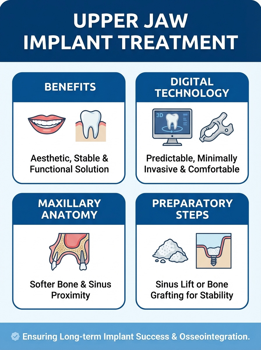 Despite the anatomical challenges of the maxilla, modern dentistry enables safe, predictable and permanent implant solutions for the upper jaw. With proper planning, advanced digital tools, and an experienced surgical team, patients achieve a natural smile, strong chewing ability and long-term comfort.